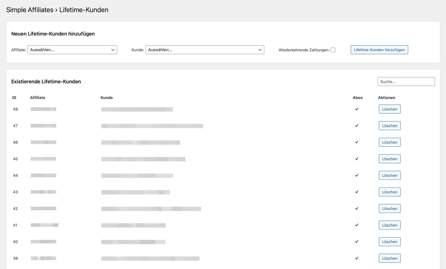 - Das ist kinderleicht möglich. Erstelle einfach einen Lifetime-Kunden und aktiviere „Wiederkehrende Zahlungen“. Bei der nächsten Verlängerung, bekommt der zugewiesene Affiliate seine Provision.